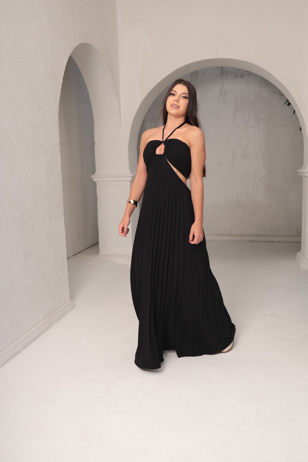 Vestido longo sofisticado com saia plissada, que traz movimento e elegância ao visual. O top possui detalhe franzido e alças finas com amarração no pescoço, garantindo ajuste personalizado e conforto, se adapta a vários tipos de corpos